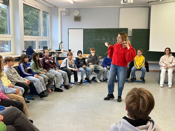 Von Beginn an sprach die Lektorin ausschließlich Französisch – und dennoch hatten die Kinder keinerlei Schwierigkeiten, ihr zu folgen. Mit viel Gestik, Mimik und Energie gelang es Manon Choplin, die Inhalte verständlich zu vermitteln und die Schülerinnen und Schüler aktiv einzubeziehen. Schnell merkten die Fünftklässler, dass sie auch ohne Vorkenntnisse überraschend viel verstehen können.