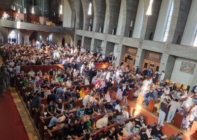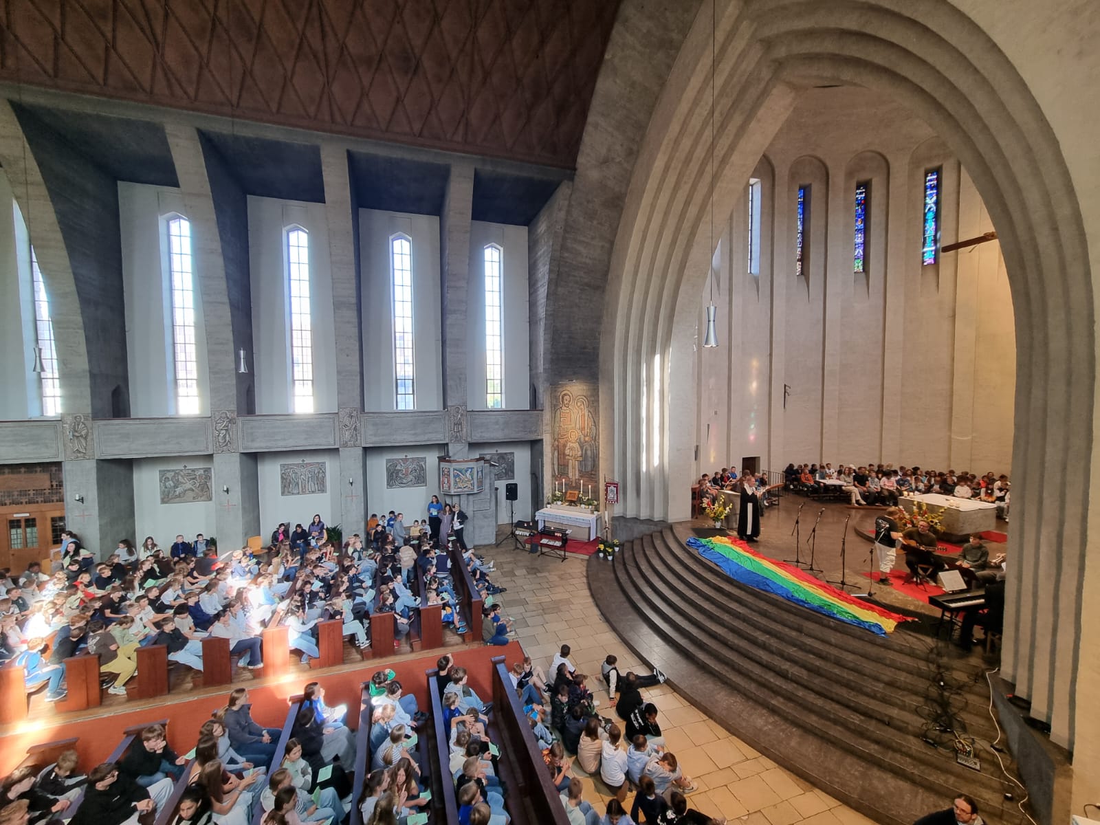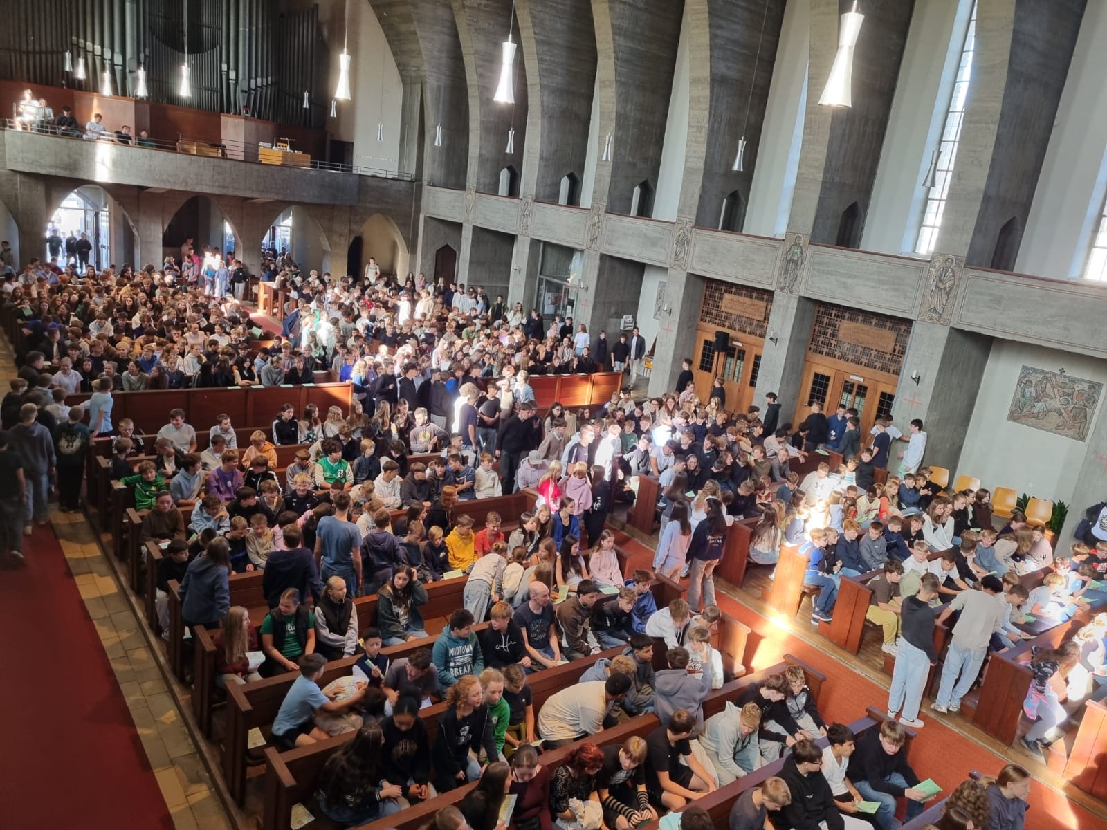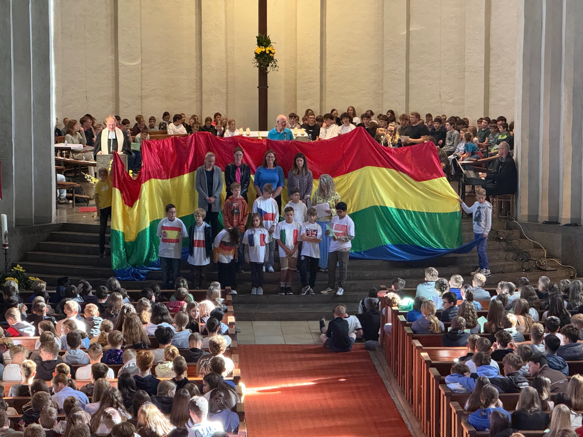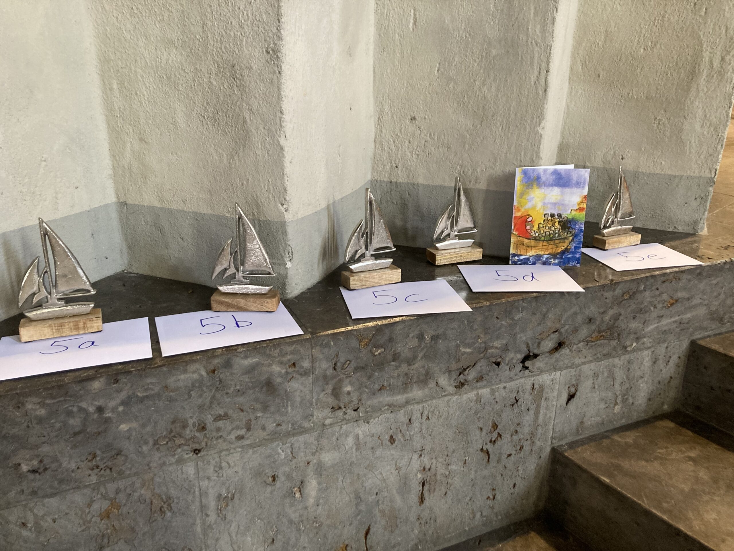 Kennst du das? Mit dieser Frage begann die Lesung unseres diesjährigen Schulanfangsgottesdienstes. Denn jeder aus unserer Schulgemeinschaft kennt diese Situation. So, wie sich jemand in deiner Umgebung verhält, ist es nicht korrekt . Du weißt, du müsstest einschreiten…Genau so geht es auch Noah. Er weiß um die Fehler der Menschen, er selbst bemüht sich jedoch nach eigenen Kräften, alles richtig zu machen…Gott sieht das und Gott hat einen Plan. Er gibt Noah und seiner Familie eine Chance. „Bau dir und deiner Familie eine Arche, ein Boot, ein geschützter Ort“, sagt er, und „nimm von jeder Tierart ein Pärchen mit“. „Auch wenn es gewittern wird und euch, die ihr in dieser Arche in einer Gemeinschaft versammelt seid, angst und bange wird, ihr euch nicht sicher seid, wie es weiter gehen wird, seid gewiss, ich sehe eure Gemeinschaft, eure unterschiedlichen Stärken und Schwächen. Ich finde für jeden von euch den richtigen Platz zur richtigen Zeit!“