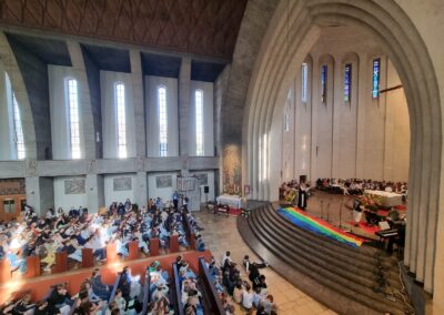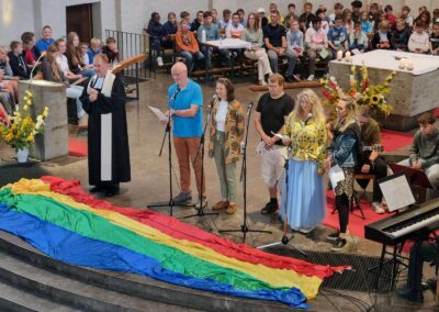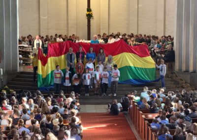 Und dieser Vertrag zwischen Gott und den Menschen wird mit einem Zeichen besiegelt. Der Regenbogen mit seinen vielen Farben ist Zeichen der Vielfalt unserer Gemeinschaft auf der Erde und der Regenbogen ist auch unser Versprechen, füreinander in der Schulgemeinschaft einzustehen – mögen wir auch noch so unterschiedlicher Herkunft sein, uns im Aussehen unterscheiden, in der Schule eine ganz bedeutende oder unbedeutende Funktion inne haben, jung oder alt sein, SchülerIn oder LehrerIn und ganz verschiedene Schwächen und Stärken haben.