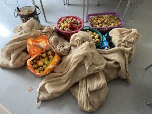 Dass heuer ein gutes Apfeljahr war, war auch auf dem Schulgelände des DG zu sehen. Alle sechs Apfelbäume trugen reichlich Früchte. Deshalb erntete die Umweltgruppe zusammen mit einer Reihe freiwilliger Helferinnen und Helfer die Bäume ab. Auch unsere Schulleiterin Frau Cleary steuerte aus ihrem Garten einige Kilogramm Äpfel bei. So konnten die Früchte nach Trabelsdorf in die vereinseigene Kelterei des Obst- und Gartenbauvereins gebracht werden. Das naturbelassene Obst wird dort auf einer Bandpresse verarbeitet, der naturtrübe Saft wird pasteurisiert und in “Bag in Box” abgefüllt. Es ist ein beeindruckendes Erlebnis, die selbstgepflückten Äpfel binnen kurzer Zeit zu Saft verarbeitet zu sehen. Über 100 Liter Saft konnten schließlich zum DG gefahren werden.