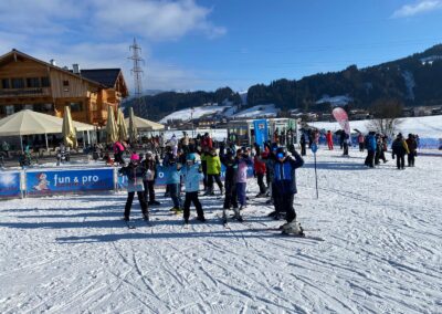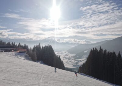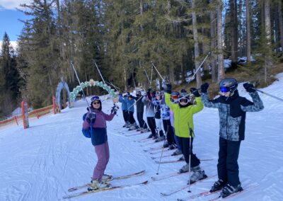 Die Vorfreude war groß, denn bald ging es mit dem Bus zur Skipiste, wo die Anfänger ihre erste Fahrt mit einem Schlepper machten und die Könner und Fortgeschrittene neue Pisten in Flachau erkundeten. Auch wenn es anstrengend und stellenweise ziemlich rutschig war, hatten alle jede Menge Spaß und waren mit vollem Einsatz dabei.