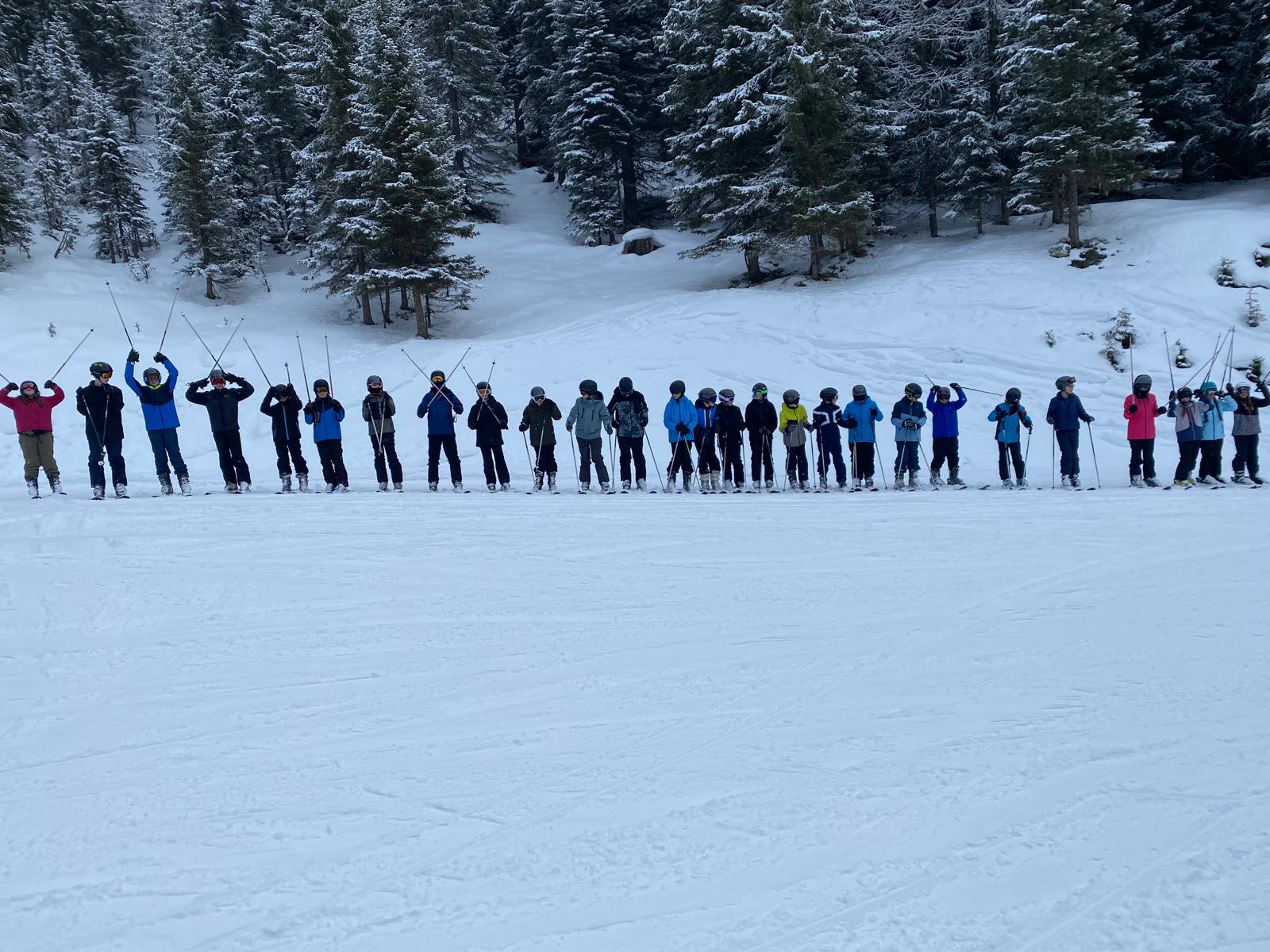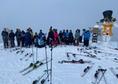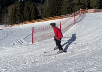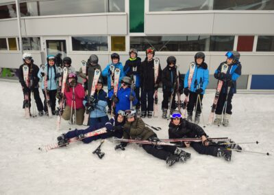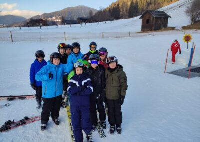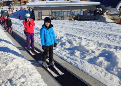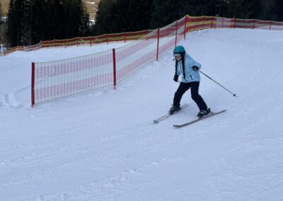 Anschließend ging es auf die Piste. Die Anfänger machten sich zuerst mit den Skiern vertraut und übten ihre ersten Kurven. Einige von ihnen konnten danach sogar schon eine richtige Piste hinunterfahren – natürlich noch in vorsichtigen, kleinen Bögen. Die Fortgeschrittenen fuhren gemeinsam mit Herrn Platzöder und Herrn Förster die Piste hinunter.