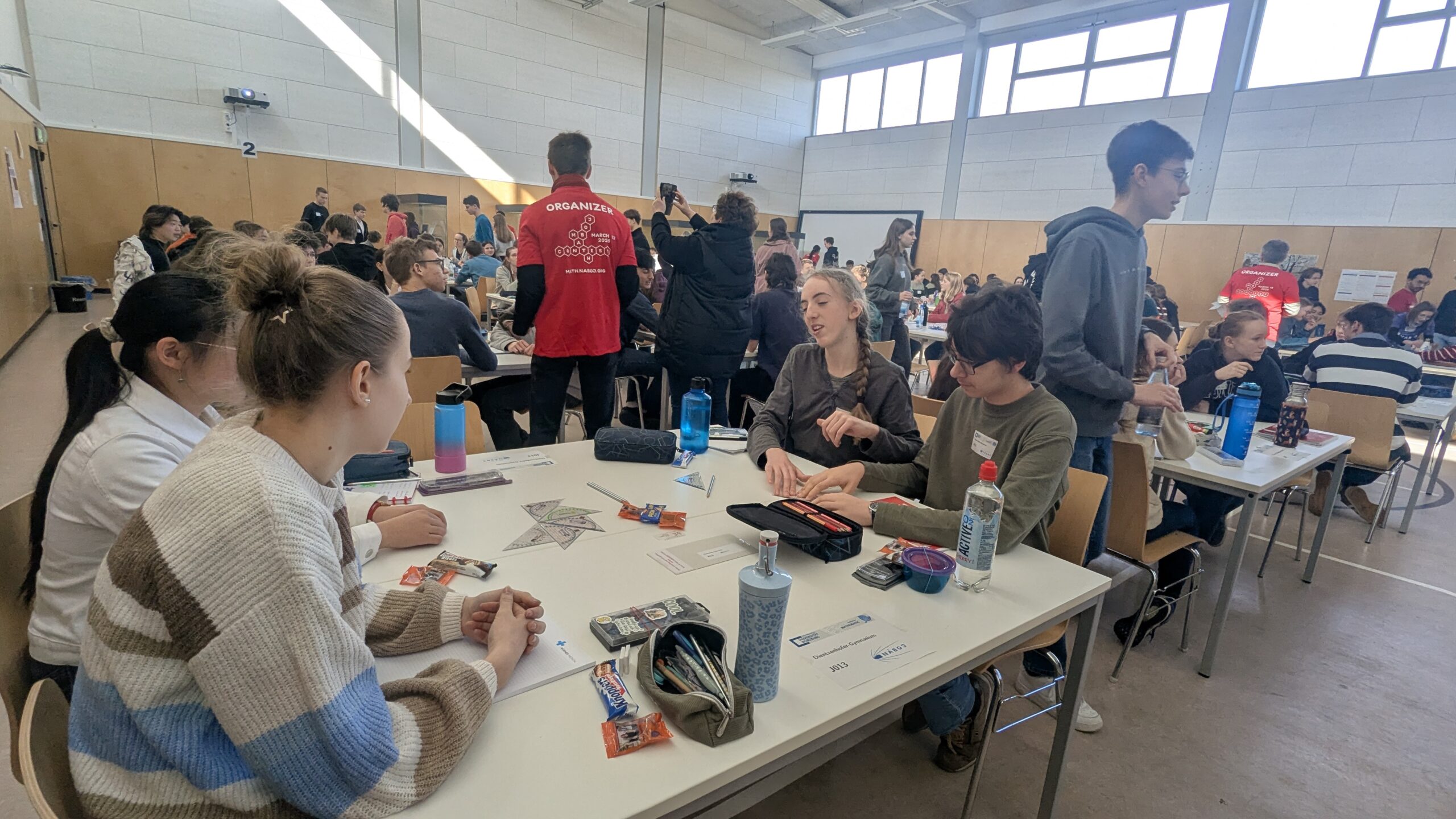 Nach unserer Ankunft und Anmeldung an der Universität in Würzburg legten wir unsere Taschen und Jacken in einen der Aufenthaltsräume, in welchen schon einige Rätsel zum Warmwerden bereit lagen. Kurze Zeit später ging es auch schon in den Prüfungsraum, wo jedem Team ein Platz zugewiesen wurde, auf welchem bereits Wasser, Gummibärchen, Schokoriegel, Bleistifte und Geodreiecke bereitlagen.