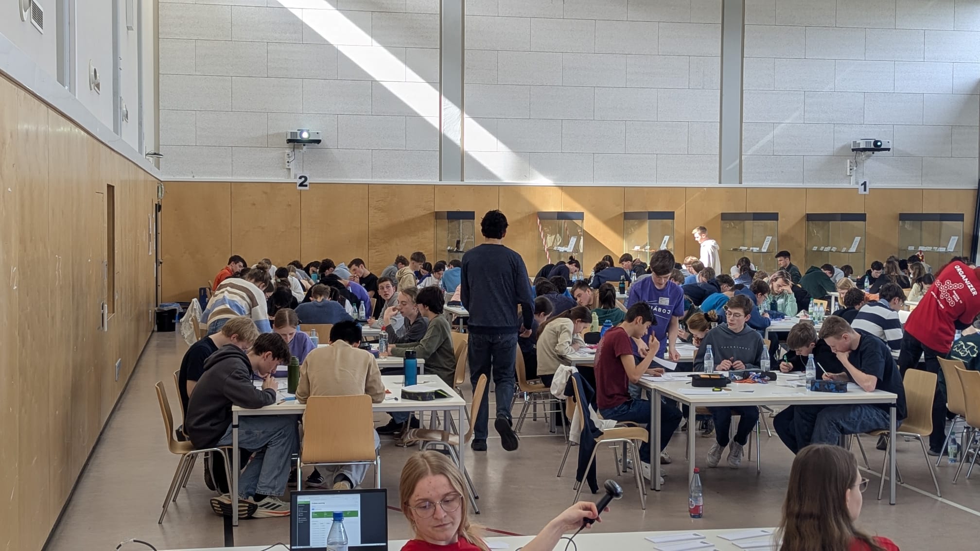 Dort erhielt man entweder einen Stempel für die richtige Lösung, den Hinweis „unvollständig“ oder die falsche Lösungszahl wurde durchgestrichen. War die Aufgabe richtig, ging man direkt zum Aufgabentisch weiter und erhielt die nächste Aufgabe, sodass immer sechs verschiedene Aufgaben am Platz lagen. Falls eine Aufgabe falsch oder unvollständig war, versuchten wir sie erneut zu lösen. Für jede Aufgabe gab es unendlich viele Versuche, aber damit nicht nur geraten wird, durfte der Korrektor ab dem dritten Versuch verlangen, dass der Lösungsweg vorgelegt wird. Während des Wettbewerbs konnten wir auf einer Liveübertragung jederzeit sehen, auf welchem Platz wir momentan deutschlandweit und an unserem Standort (Würzburg) standen. Nach 119 Minuten wurde uns die letzte Minute angekündigt, in der sich alle Teams noch für die Abgabe von Lösungen anstellen konnten.