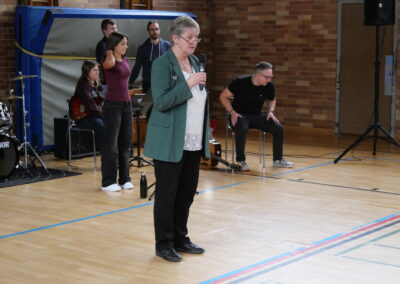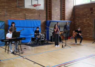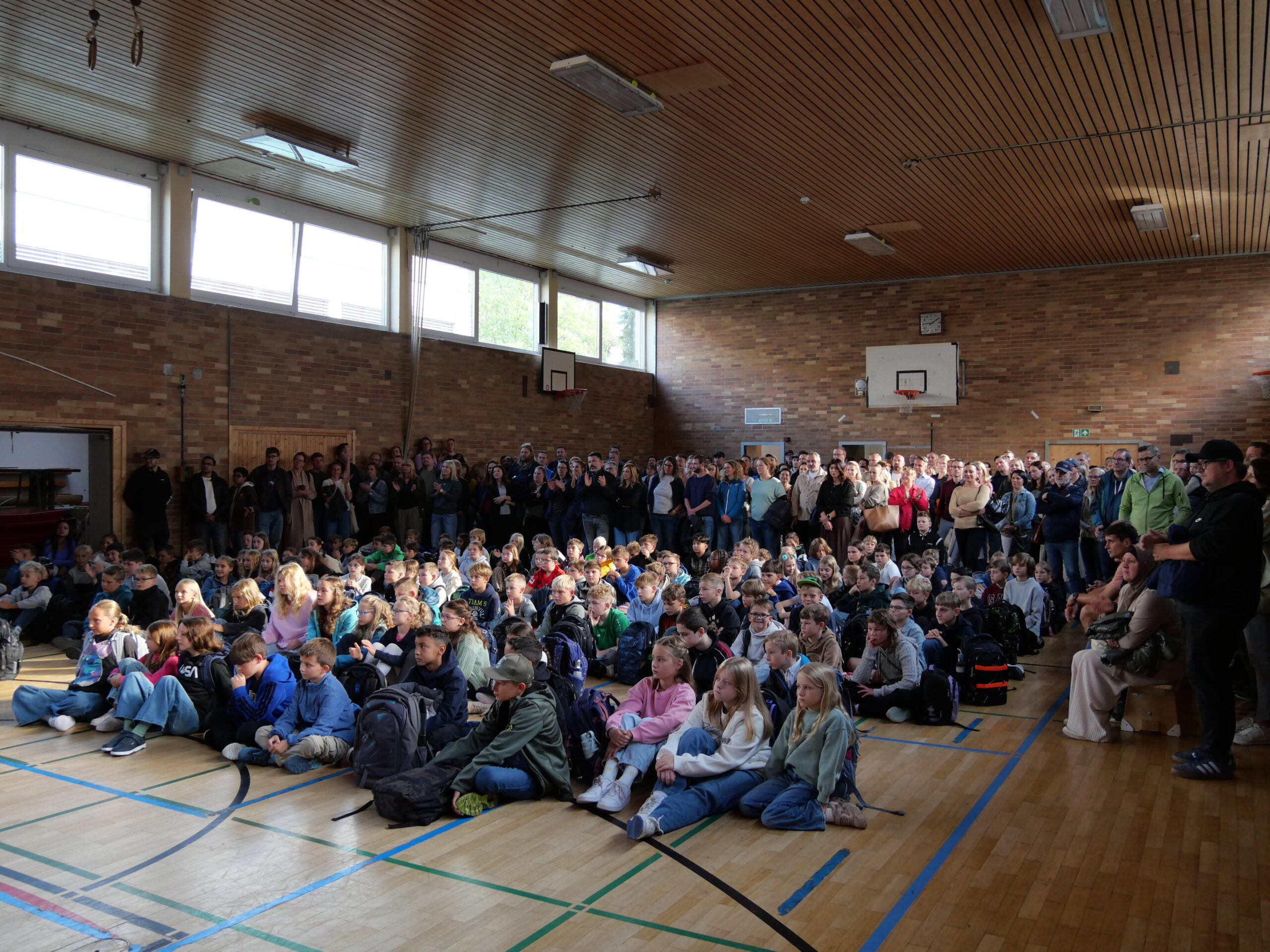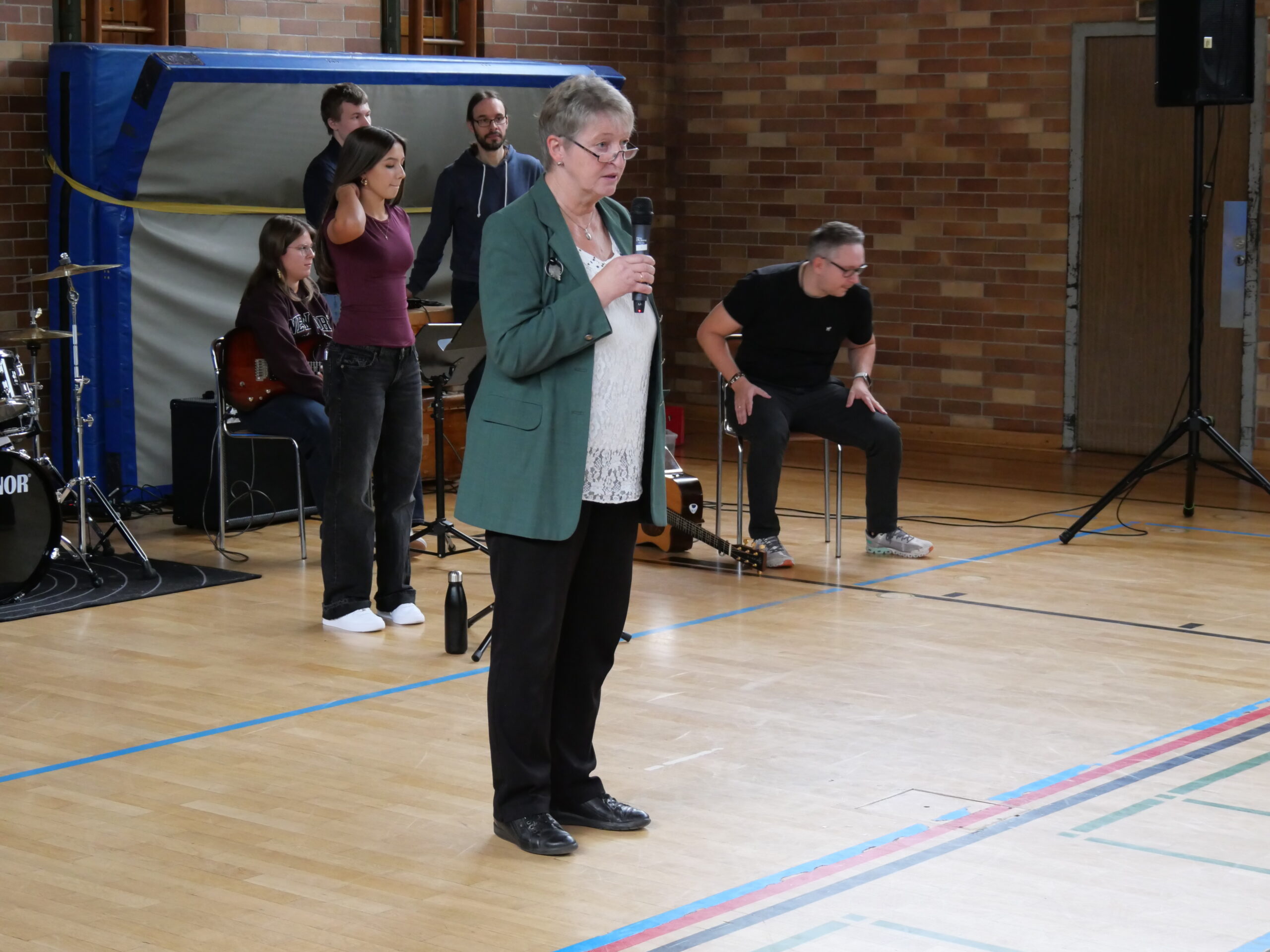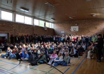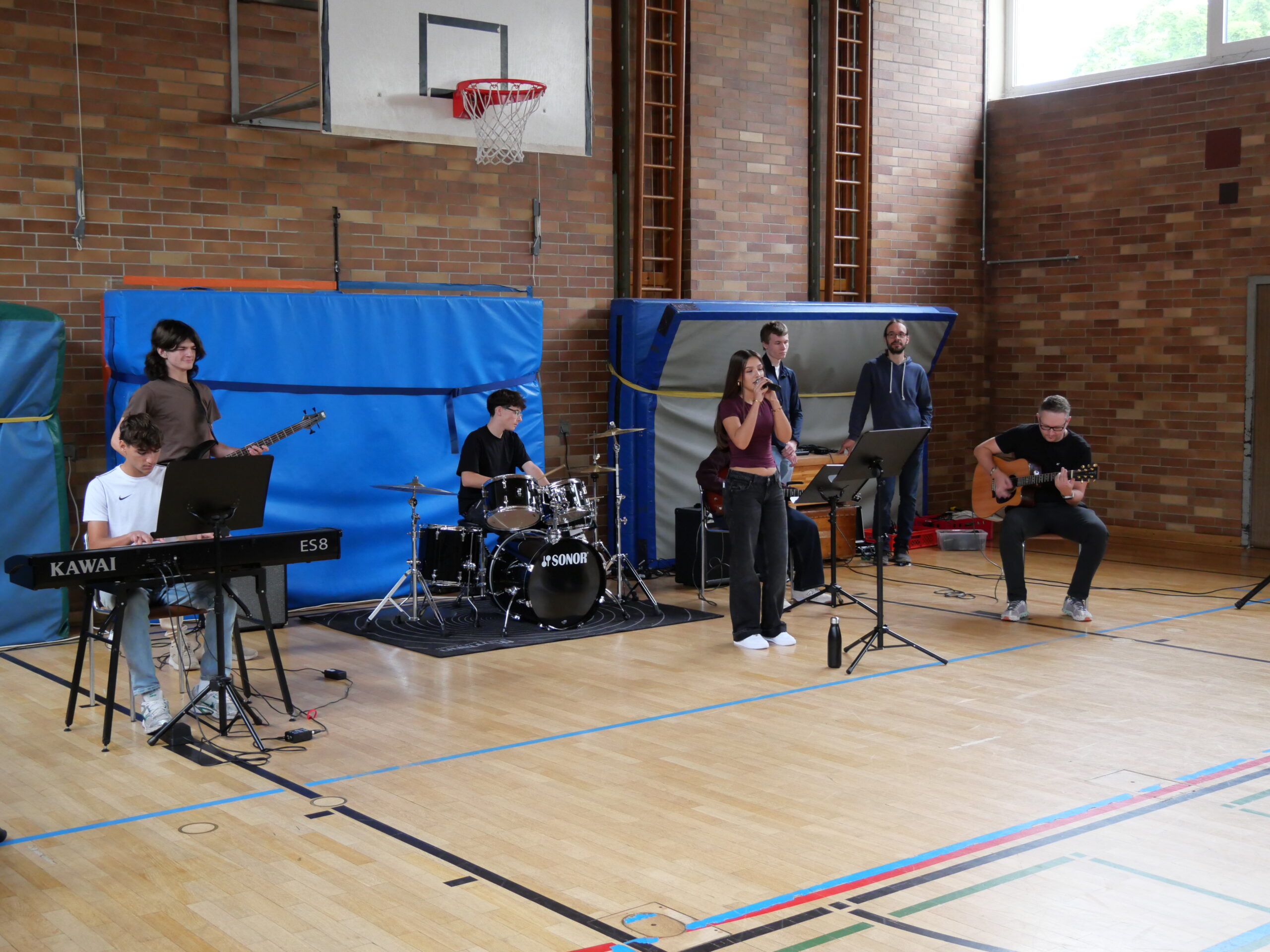 Heute war für die neuen 5.-Klässler/-innen der große Tag gekommen. In der Turnhalle 2 des Dientzenhofer-Gymnasiums wurden sie zunächst von der Schulband unter der Leitung von Herrn Schäfer musikalisch empfangen, bevor sie die Schulleiterin Frau Cleary begrüßte und in die Schulgemeinschaft einführte. Den Abschluss bildete ein mitreißender Song, der sogar zu so früher Stunde zum Mitklatschen animierte. Während die Schülerinnen und Schüler in ihre Klassenzimmer geführt wurden, bewirtete der Elternbeirat die Eltern, die so auch die Gelegenheit erhielten, schon erste Kontakte zu knüpfen.