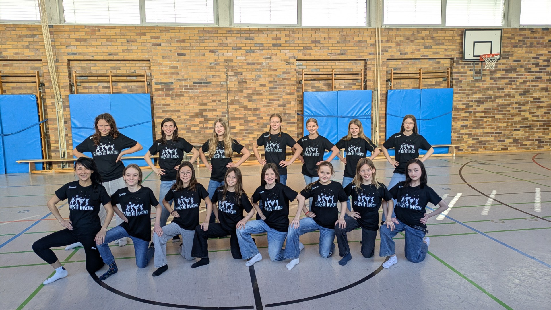 Die Schülerinnen und Schüler der ersten DG-Tanz-AG durften sich ihren eigenen Namen für das neue Wahlfach überlegen. Jeder, der Lust hatte, brachte seine Ideen ein – in der Namensfindung, wie auch im Design. Am Ende standen drei Finalversionen zur Auswahl. Jedes Kind hatte eine Stimme abzugeben, wie auch der Fachschaftsleiter Sport und die Tanzlehrerin durften sich an der Wahl beteiligen. Am Ende siegte der Name: Stars of Dancing!